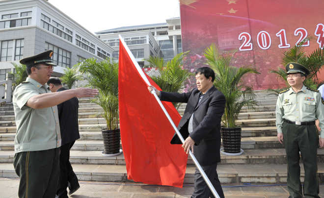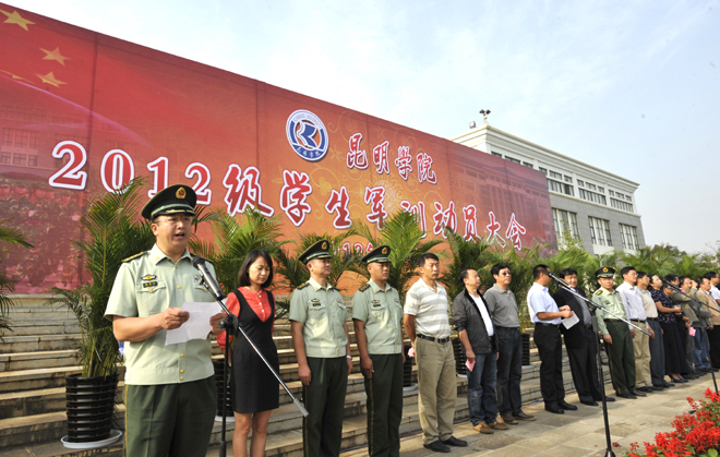 2012级军训团陈应海团长向全体参训人员宣读了学生军训管理规定,对参训教官和同学提出要求,希望同学们能通过军训加强集体观念,培养团队意识,严格要求自己,主动迎接考验,遵守纪律,磨练意志,锻炼体魄,高质量地完成军训任务。