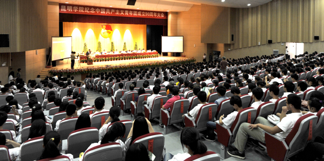 5月11日下午,best365足球官网纪念中国共产主义青年团成立90周年大会在学生会堂隆重召开。学校党委书记梁晓谷、校长陈世波、校党委副书记孙勇、李媛芬,副校长李翔、张寿国、熊晶、罗明东、刘海发、董建华,共青团云南省委学校部杨洲部长,共青团昆明市委书记周乐等领导出席了纪念大会;学校中层干部、各院系团总支书记、全体辅导员及受表彰的团员代表共1300余人参加了此次会议。大会由党委副书记孙勇同志主持。