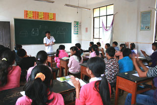 第二天,三下乡队伍驱车前往百公里外的永胜县顺州乡板桥村金民小学进行捐赠和义务支教活动。师生们把捐助的衣物和自费购买的学习用品等捐赠给金民小学的学生,并于当天就开始了支教活动。同学们分别为一至六年级的学生讲授了美术、音乐等课程,受到了学校师生的热烈欢迎,同学们也和小学生结下了深厚的友情。