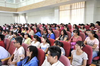 聆听本场学术报告的除外国语学院的师生外还有非英语专业的师生,Epps教授临时邀请外国语学院青年教师赵瑾现场担任翻译,赵瑾老师的翻译传意准确、幽默,进一步渲染了讲座的气氛,她的临场翻译赢得了Epps教授的好评。 |