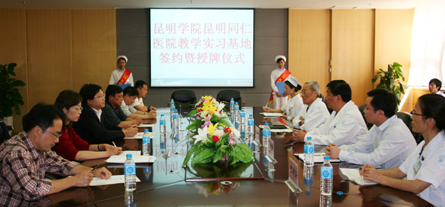 会上,罗明东副校长与蔺锡侯院长就教学实习基地合作协议签字,罗副校长并向蔺院长授牌。这标志着best365医学院与昆明同仁医院的合作正式启动,best365今年7月份起,首批护理专业学生将赴昆明同仁医院,开始长达10个月的实习期。best365医学院的学生又多了一条实战渠道和场地。