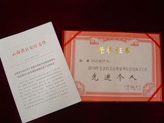 近日,云南省公安厅对2010年全省机关企业事业单位内部治安工作进行表彰,best365足球官网保卫处再次获得“全省机关企业事业单位治安保卫工作先进集体”称号;保卫处副处长孙丽同志获得“全省机关企业事业单位治安保卫工作先进个人”称号(云公治[2011]46号)。这是保卫处在云南省公安厅对全省企业事业内部单位治安工作表彰中第三次蝉联该项荣誉称号。