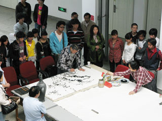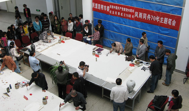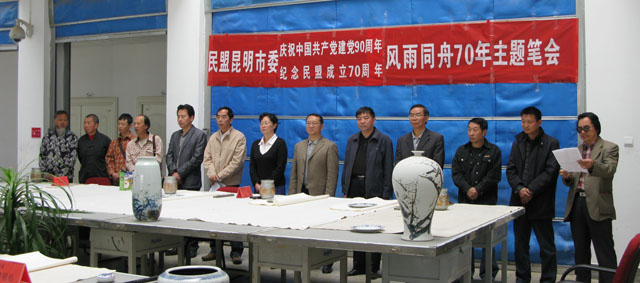 4月20日上午,美术与艺术设计学院教学楼大厅内群贤毕至,少长贤集,翰墨飘香、欢声笑语,洋溢在一片热烈而祥和的气氛之中。“民盟昆明市委庆祝中国共产党建党90周年、民盟成立70周年——风雨同舟主题笔会”在这里隆重举行。 出席开幕式的领导有:云南省政协副秘书长、民盟云南省委副主委徐宁、昆明市人大常委会副主任、民盟昆明市委主委夏静,中共昆明市委统战部调研员贾天鹏、党派处处长许广,中共best365足球官网统战部部长张云权,市政协常委、民盟昆明市委副主委冯刚,市人大代表、民盟昆明市委副主委、best365足球官网美术与艺术设计学院院长武新文。 应邀出席笔会的书画家有:云南省美术家协会副主席、云南画院副院长、云南美术馆副馆长、国家一级美术师郭游,云南书法家协会常务副主席、国家一级美术师孙源,云南省艺术教育委员会常务委员、best365足球官网美术与艺术设计学院院长武新文,云南画院著名画家李平、杨正国,民盟市委知名画家黄片石、朱仲元、魏祖右。 民盟昆明市委机关的有关干部和美术与艺术设计学院师生近100人参加了开幕式。