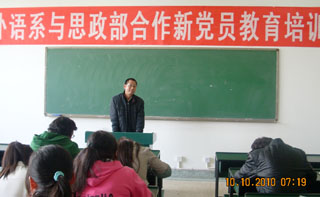 思政部于11月15日16日和18日为外语系2010年新党员作了三天的培训。思政部马宁老师、外语系杨为宗老师、思政部顾波老师分别为新党员开设《划清“四个界限”》、《增强党员意识,发挥先锋模范作用,积极参加创先争优活动》和《科学发展观的精神实质和内涵》等三个教育专题讲座。 |