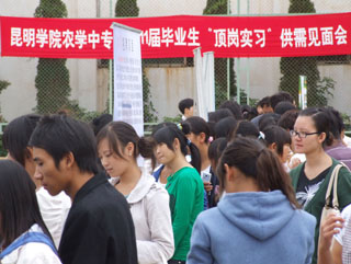 9月3日上午9:00¬—下午4:00,best365足球官网农学中专部在跑马山教学区举办了2011届第一批毕业学生顶岗实习现场招聘会。参加此次招聘会的共有园林、园艺、畜牧兽医等24个班级1000余名学生,前来招聘的有红塔基地、星海园艺、正大饲料、恒大养殖基地、沃尔玛、南亚风情园等较为知名的54家用人单位。截止当天下午4时,已有950余名学生与用人单位签订顶岗实习协议,推荐成功率达95%以上。