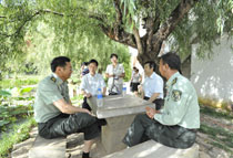 汇报会结束后,我院梁书记、陈院长等院领导在昆明陆军学院赵副院长的陪同下,参观了陆军学院专门投资新建的军训基地,院领导们察看了学生在军训基地的住宿、就餐、文化娱乐设施,询问了学生军训生活与收获感受,对今后军地两院校加强合作,互通有无,搞好共建给予较高评价和期待。