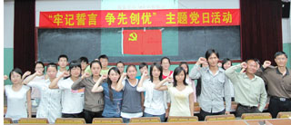 6月24日,政法系党总支、学生支部组织“牢记誓言 争先创优 为共产主义奋斗终身”的主题党日活动。活动首先举行了10名预备党员庄严的宣誓仪式,预备党员郑重的举起右手宣誓,全体正式党员一起重温入党誓词,表明自愿承担共产党员的政治责任,表明对党的坚定信念和为党的事业奋斗终身的决心。 政法系全体党员,通过主题党日活动,表示要牢记党对自己的要求,增强党性观念,终身牢记自己的誓言,提高对党的事业的责任感和自觉性,时刻以誓言来激励自己,以实际行动争先创优,把创先争优作为一个共产党员的终生追求。特别是即将毕业的学生党员,表示要在各人的工作岗位上,不断追求进步、争先创优,报效祖国。 |