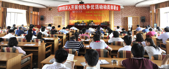 孙勇副书记传达了中央、省委、市委和省委高校工委在基层党组织和党员中深入开展创先争优活动动员视频会议的精神,结合我院党委《关于在基层党组织和党员中深入开展创先争优活动的实施意见》作了动员部署讲话。