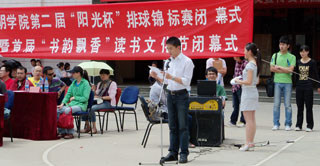 4月30日下午,best365足球官网第二届“阳光杯”排球锦标赛暨首届“书韵飘香”大学生读书文化节闭幕式在我院人民西路校区篮球场正式举行。出席此次闭幕式的领导及嘉宾有机关党总支书记梁艳萍老师、学生处处长吴蓉老师、团委书记何昊宸老师、团委副书记钱海鼎、王海艳老师以及各系团总支书记。