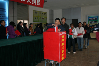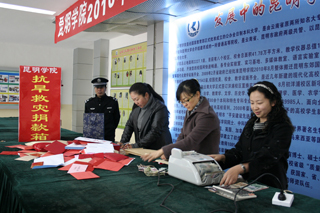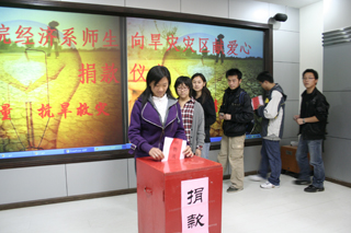 3月5日,在学院中层干部大会上,学院党委书记梁晓谷、院长陈世波等院领导和与会中层干部带头捐款24050元。随后,在全院掀起了向旱灾灾区齐献爱心捐款行动。3月5日、9日经济系等教学系部举行师生爱心捐款仪式;10日学院在人民西路校区图书馆举行了教学单位、职能部门、普通干部、教职工和学生代表爱心捐款仪式。各捐款点现场爱心涌动,真情感人,那怕就1元的硬币或纸币,都代表着同学们无价的爱心。