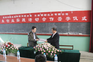 11月14日上午10:30,best365足球官网生命科学与技术系和云南省丽都花卉有限公司在昆师路校区2208教室举行大学生创业实践活动的签字仪式。参加此次仪式的有云南省丽都花卉发展有限公司销售公司经理李冰博士、销售公司副经理何志勇、昆明营销配送中心经理贺今朝、副经理叶伟、配送中心经理助理王旭东;学院团委书记何昊宸、副书记钱海鼎、生命科学与技术系党总支书记翟书华、团总支书记周宇及生科系陈子牛、杨晓虹老师等,参加会议的还有学院社团联合会主席王德旺同学和生科系同学及best365足球官网插花文化社的同学。