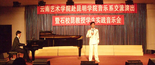 10月27日晚,云南艺术学院继续教育学院副院长石校昆教授带领部分学生到音乐系交流演出。音乐系系主任靳丽芬、党总支副书记王耀勇、主任助理黄清林及龙泉路校区的部分师生近五百人观看了演出。
