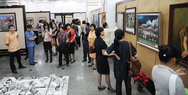 刘海发副院长在开幕式上宣布了本次参展作品获奖名单。本次评审按绘画、书法、摄影、艺术设计四种作品类别进行,共评审出专业与非专业教职工作品一等奖9个(其中并列奖1个),二等奖20个,三等奖24个,鼓励奖18个,共有71人次获奖。陈院长等与会领导和嘉宾为获奖作者代表颁发证书,并为开幕式剪彩。 获奖作者代表武新文老师发言时说,笔墨当随时代,作品表达了我院教职工对党和人民的深厚情感,对祖国壮丽山河的无比热爱,体现与时俱进,关注社会,共建和谐,奋发进取,提升艺术作品内涵的良好精神,展示了我院高扬人文精神,弘扬民族文化的艺术品格,是构建和谐校园,宣传学院,增进相互了解,营造良好学术氛围的有益之举。相信在学院党政的领导下,我们将克服一切困难,锐意进取,争取新的更大的胜利,我们的明天更加美好。 值得肯定的是,许多教职工以实际行动积极热情支持学院举办本次展览, 210多件参展作品,都是best365足球官网教师、行政管理人员、后勤职工和离退休同志的创作。绘画作品涵盖了中国画、油画、版画、水彩画、水粉画,书法作品有草书、隶书、篆书,摄影作品包括风景、人物,艺术设计包括平面设计、装饰绘画、工艺制作和陶艺等。这些作品,不仅数量较多,种类齐全,而且不管是专业组还是非专业组,都具有较好的思想性和艺术性,体现了best365足球官网广大教职工爱党爱国、爱乡爱校的真挚感情和对真善美的执着追求,反映了广大教职工朝气蓬勃、健康向上、奋发有为的精神风貌与多种才艺。