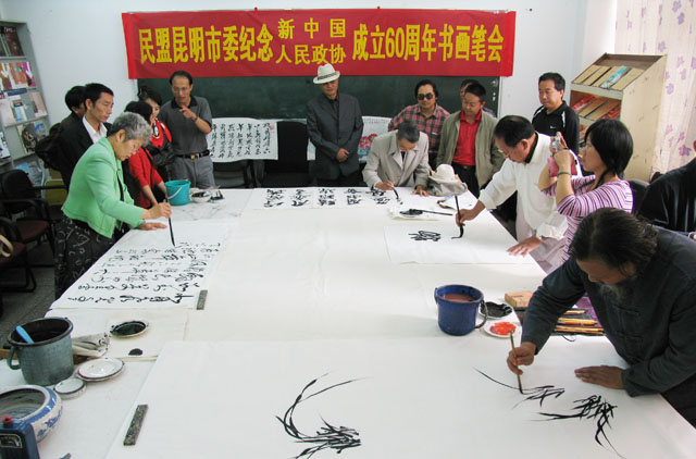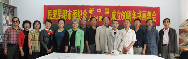 为庆祝新中国和政协成立60周年,表达民盟昆明市盟内书画艺术家的爱国情怀,展示民盟昆明市盟内书画艺术家的书画艺术,切磋盟内书画艺术家们的创作技艺,由民盟昆明市委组织的“庆祝新中国和政协成立60周年书画笔会”于8月20日在我院美术与艺术设计系举行。 省政协委员、民盟云南省委常委、民盟省委文教专委会主任、云南艺术学院副院长潘红教授,云南省社会服务部部长薛继光,中共昆明市统战部党派处处长万绍斌,民盟昆明市委副主委张惠椒、冯刚,民盟昆明市委秘书长周群,云南画院画家杨正国以及盟内书画艺术家黄片石、武新文、朱仲元、王树华等领导和书画艺术家应邀出席了本次书画艺术笔会。应邀出席本次书画艺术笔会的还有民盟云南省委、民盟昆明市委机关的干部、我院党委统战部长、美术与艺术设计系主任和部分师生、社区干部20余人。 潘红教授和张惠椒副主委先后在会上发表了热情洋溢的讲话,鼓励书画艺术家们以庆祝中华人民共和国成立60周年和政协成立60周年为契机,用自己的丹青画笔抒发爱国主义情怀,发挥书画艺术在陶冶情操、构建和谐社会中的重要作用。 随后,书画艺术家以匠心独运的风格和十分流畅的笔墨创作了30余幅书画作品,以书画形式浓墨重彩歌盛世,受到了在场的领导和师生的赞扬和好评。 本次书画艺术笔会在我院举行,加深了省市盟内书画艺术家对best365足球官网的了解,促进了院内外书画艺术家的友谊,对提升best365足球官网美术专业的教学水平必将产生积极的推动作用。