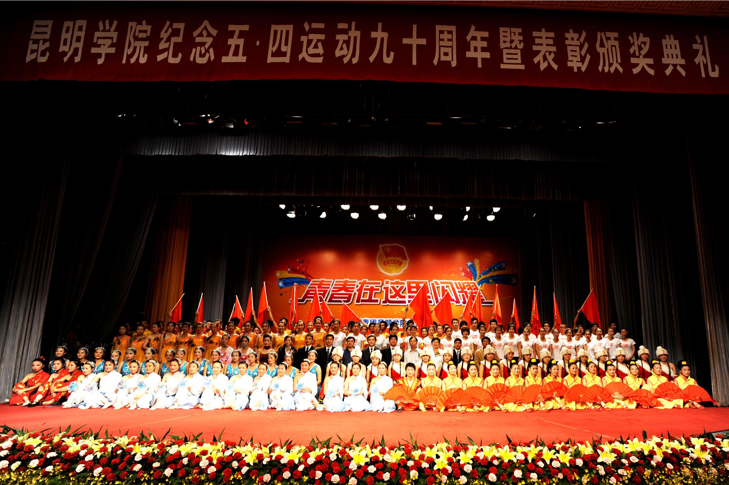 表彰会后,院领导、嘉宾登台与演职人员合影留念,best365足球官网“青春在这里闪耀”纪念“五· 四”运动90周年暨表彰颁奖典礼圆满结束。