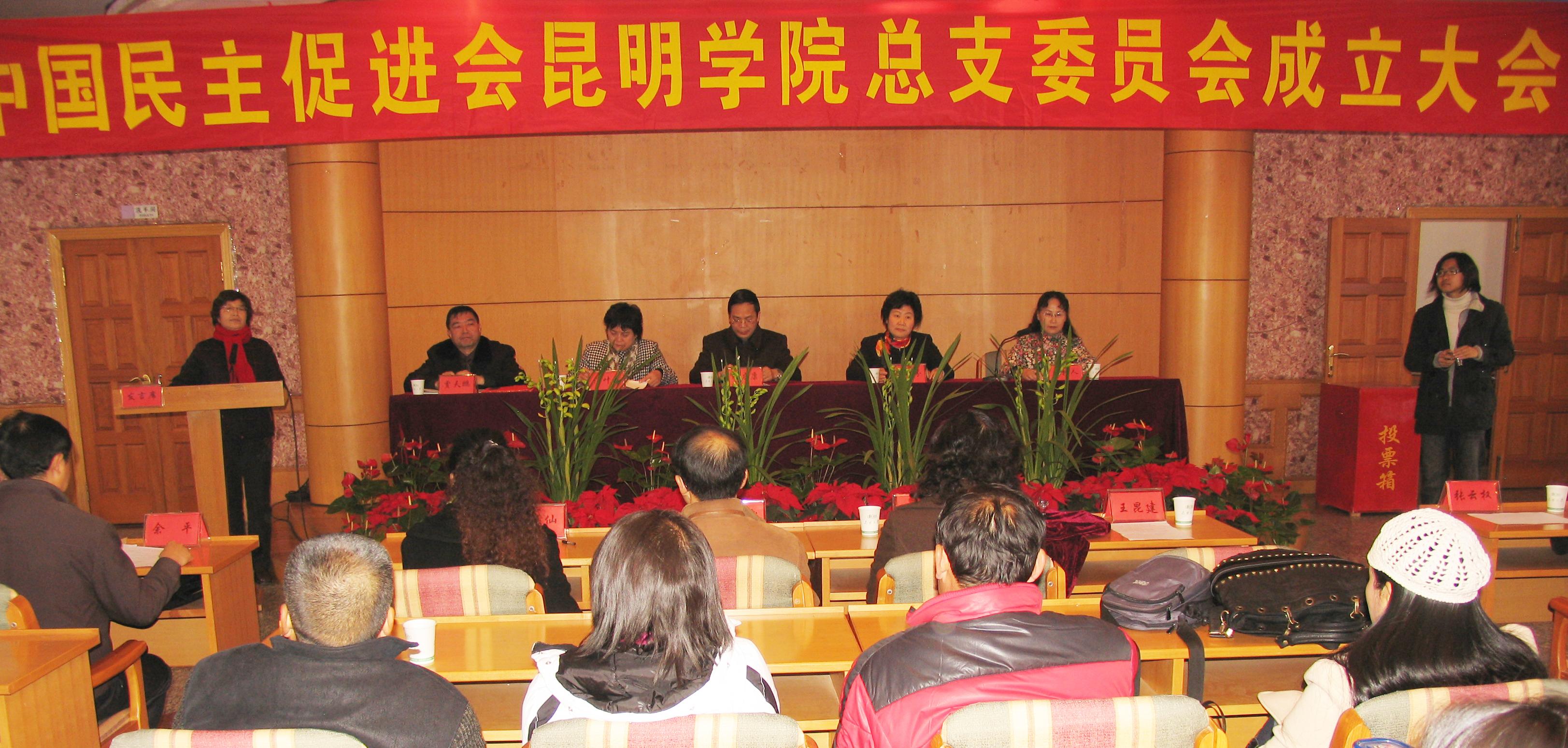 在民进云南省委、昆明市委的领导和best365足球官网党委的指导下,在民进best365足球官网全体会员的努力下,2008年12月6日,民进best365足球官网第一届总支委员会成立大会胜利召开。出席大会我院应到会员70余人,实到会与委托投票会员61人。应邀出席成立大会的来宾有民进省委副主委陈友康、中共昆明市委统战部副部长贾天鹏、中共best365足球官网党委副书记李媛芬及统战部负责人,best365足球官网民革、民盟、致公党、九三学社的代表也应邀出席了大会。