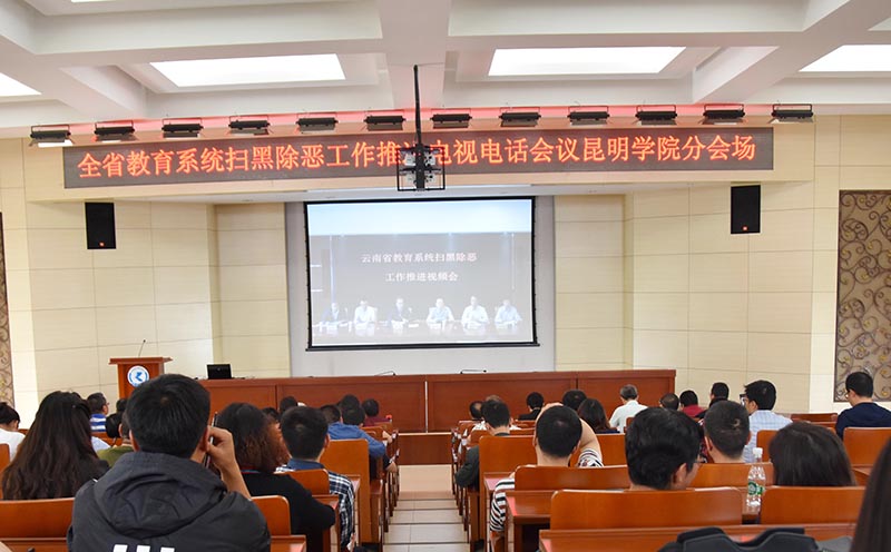 4月29日下午,云南省教育系统扫黑除恶工作推进电视电话视频会议召开。best365足球官网在办公楼D区三楼报告厅设分会场,学校党委书记陈永明,校长黎素梅等全体校领导。学校各职能部门和二级学院领导,经开区教育局所属中、小学和幼儿园领导,保卫处全体人员及云南飞虎保安公司驻校保安大队业务骨干共120余人在分会场参加会议。