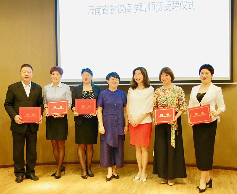 在参会人员的共同见证下,张宪荣会长和田芙蓉院长一同为聘请的专家和大师发放聘书,并在会后一同参观了云南省餐饮商学院教室。