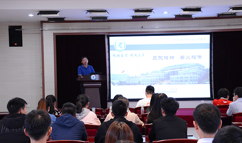 马银海副校长以《昆院精神 薪火相传》为题进行校史校情教育。马银海副校长主要从“科学定位 凸显应用特色”、“以师为重 提升师资水平”、“以生为本 提高培养质量”、“改革创新 增强发展动力”四个方面向学生介绍学校办学历史、办学定位、人才培养目标及要求等,并始终以一名教师的身份谆谆教导,鼓励研究生要尽快适应新的生活环境及学习要求,做到:树立远大理想、热爱伟大祖国、担当时代责任、勇于砥砺奋斗、练就过硬本领、锤炼品德修为,努力成人成才,为国家发展和社会进步作出积极贡献。