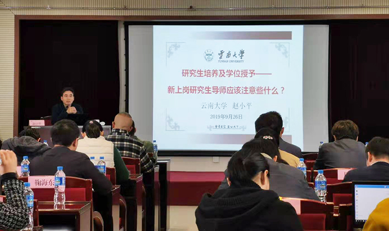 培训班还邀请云南大学研究生院学科建设办副主任、硕士生导师赵小平教授,学校教师教育学院院长、心理健康教育与咨询中心负责人王荔教授分别作《研究生培养及学位授予——新上岗研究生导师应该注意些什么?》、《研究生心理健康与促进》的专题培训。赵小平教授就如何履行导师职责,做好研究生培养、教育工作,提出具有操作性、实践性的指导意见。王荔教授从研究生心理健康的主要问题、影响研究生心理健康的主要因素及促进研究生心理健康三个方面,对研究生的培养教育过程中,如何了解、掌握研究生的思想、心理状况及如何有效帮助促进研究生的健康成长进行全面辅导。