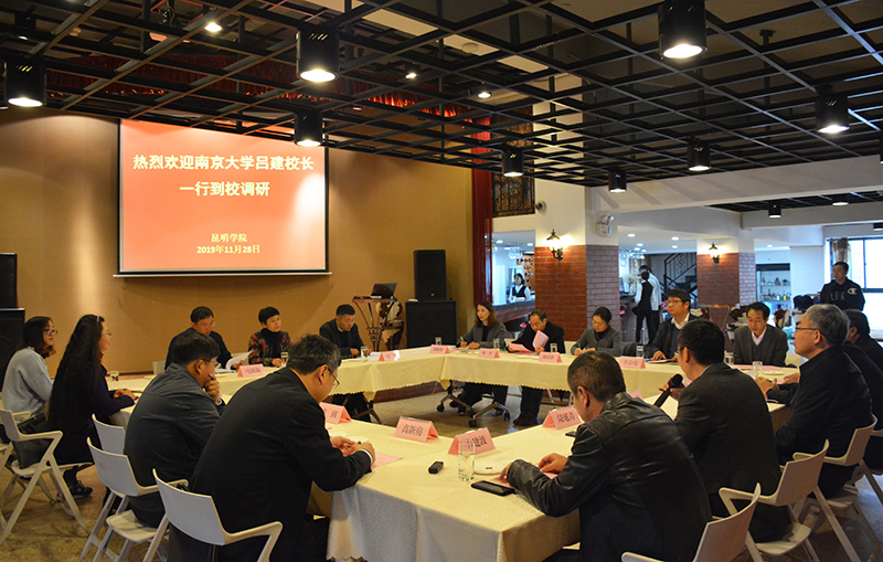 11月28日,南京大学校长吕建、副校长陆延青一行11人到校调研指导教育帮扶、科研合作等工作。best365足球官网校长黎素梅,副校长马银海、王凡与来宾在旅游学院酒水实验室进行座谈交流,王凡副校长主持座谈会。