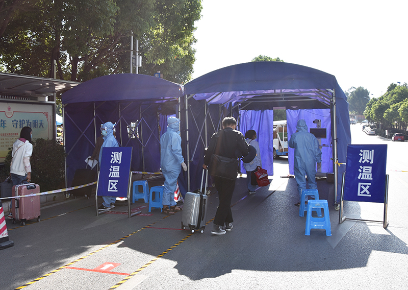 14日清晨7点,一个个显目的安全通道指示牌、一排排整齐划一的隔离栏和遮阳帐篷等防疫准备工作早已就位,学校医护人员、安保人员和院系辅导员已按时到岗,正以饱满的热情静候久别的同学归来。