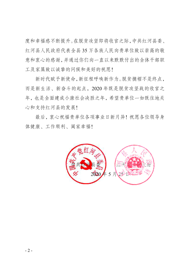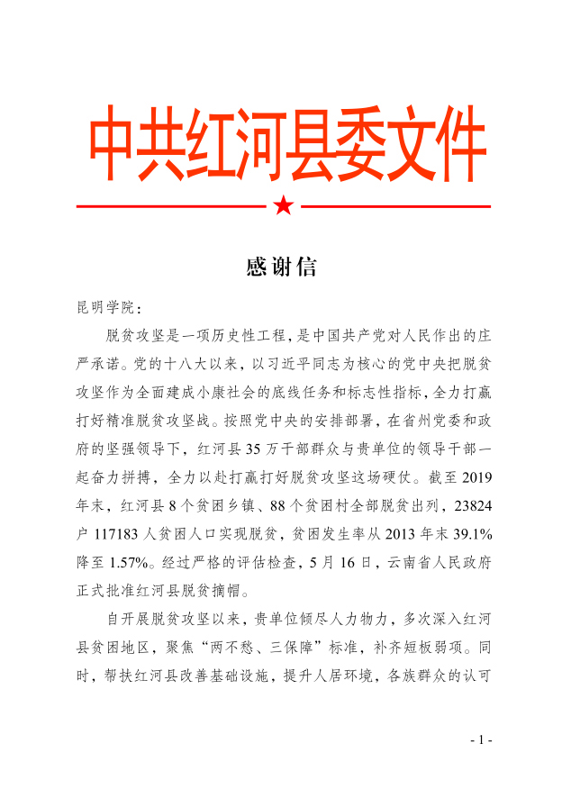 5月16日,云南省人民政府正式批准红河县脱贫摘帽。5月25日,红河县委、县政府向学校致信,感谢学校对红河县脱贫攻坚的帮扶支持。