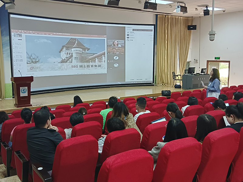 薛硕悦向各位老师介绍了SEG(Swiss Education Group)瑞士教育集团,是瑞士规模最大、综合排名第一的款待业管理教育集团。并从学校教育、师资、优质认证、就业平台方面等方面阐述了集团优势。他还特别向各位老师介绍了SEG旗下四大品牌大学的基本情况及课程设置。四所大学分别是瑞士酒店管理大学、瑞士恺撒里兹大学、瑞士蒙特勒酒店工商管理大学和瑞士美食艺术管理大学。这四所大学在2021年QS世界大学学科排名酒店管理类均在前10之列。