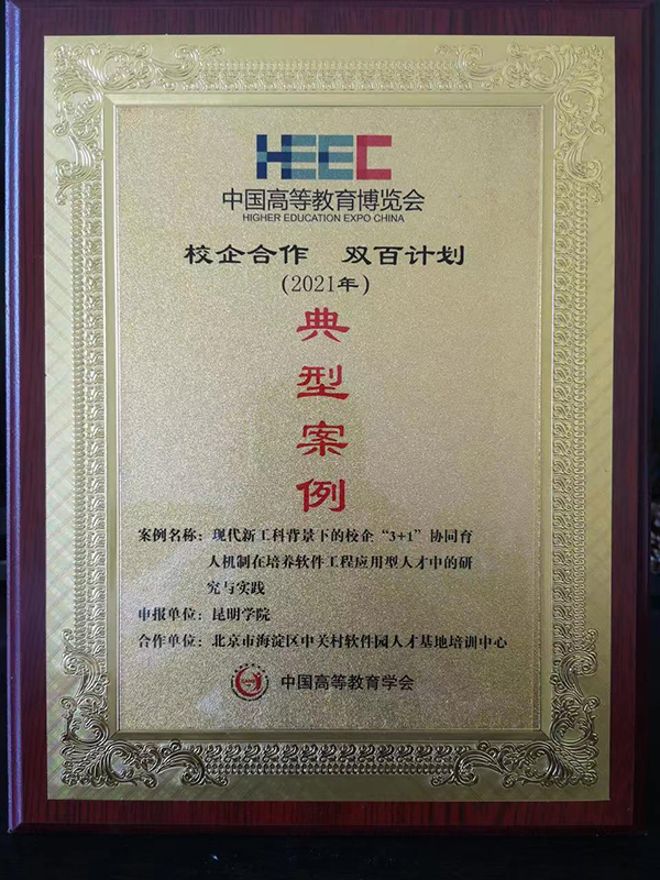 经资格审核、网络盲审、线上线下“双走访”、专家推荐以及网上公示等环节,云南省共有4所高校6项案例入选为典型案例。best365入选案例信息工程学院与北京市海淀区中关村软件园人才基地培训中心联合申报的《现代新工科背景下的校企“3+1”协同育人机制在培养软件工程应用型人才中的研究与实践》项目,基于双方在软件工程专业建设及人才培养方面多年合作所取得的显著成果,作为推广创新产教融合、校企合作的典范,成功入选专业建设类“校企合作 双百计划”典型案例,并在第57届中国高等教育博览会上获得表彰。