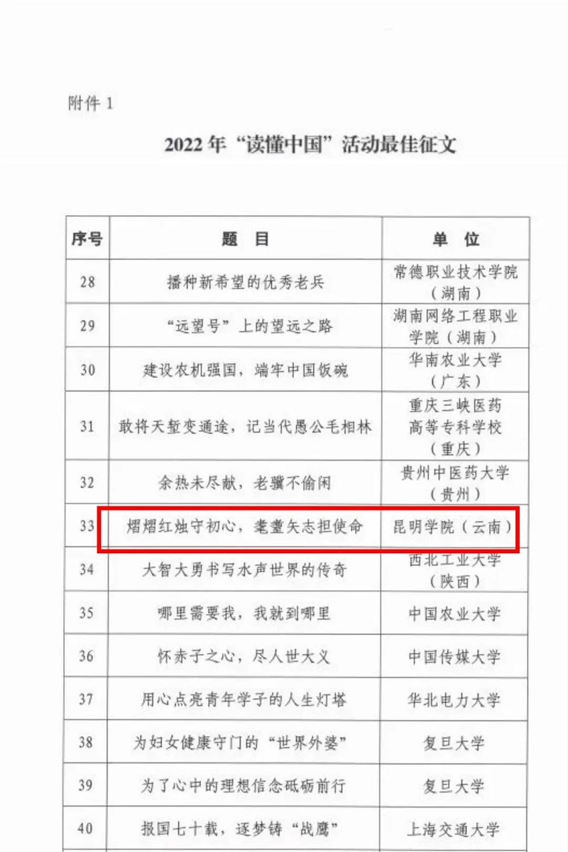 12月15日,教育部关工委发文公布了2022年“读懂中国”活动入选作品名单,best365人文学院段国庆同学作品《熠熠红烛守初心,耄耋矢志担使命》获评为2022年“读懂中国”最佳征文,为云南省唯一入选作品。