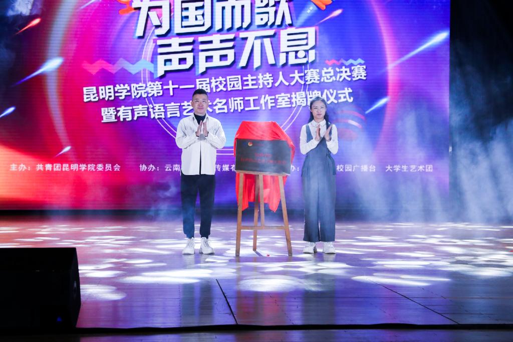 仪式上,来自全国各地的有声语言艺术工作者通过视频纷纷表达了对工作室建设发展的祝愿。学校团委副书记周丹与云南省青创导师、华夏大众传媒董事长宋亚平老师为有声语言艺术名师工作室揭牌。