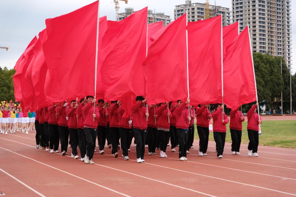伴着雄壮激昂的音乐声,国旗班、红旗队、鲜花队和裁判员代表队、各二级学院、易班方队精神饱满、口号响亮,以昂扬的状态,迈着整齐的步伐入场。