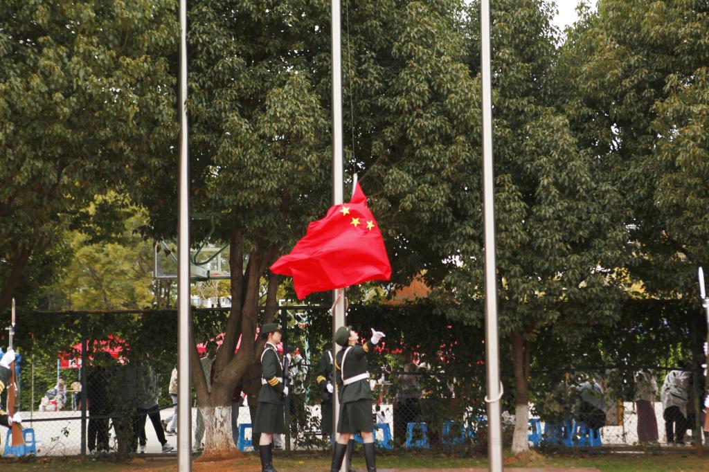 全体师生面向国旗高唱国歌,肃立致敬