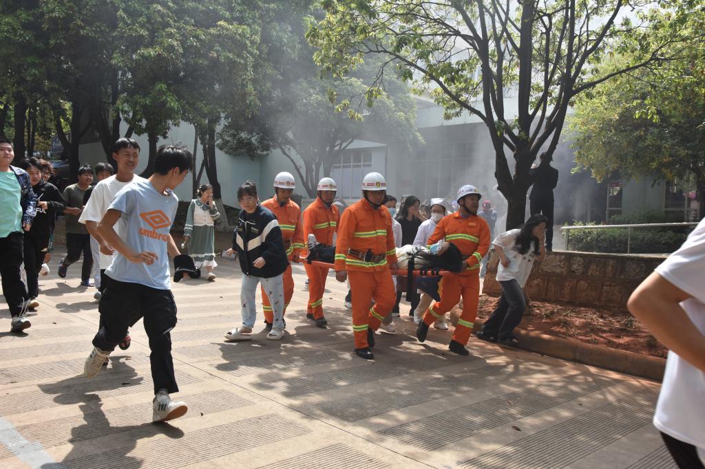 演练模拟了学生宿舍发生火灾的情景。随着宿舍门口浓烟滚滚,后勤宿管中心工作人员迅速发现“火情”,立即向校园监控指挥中心报告。接警后,义务消防员迅速响应,宿舍内随即响起警报。宿管中心工作人员和辅导员迅速行动,指导学生用湿毛巾捂住口鼻,降低身体重心,有序撤离至安全区域。疏散引导组成员按照预定路线,高效引导学生撤离至综合馆西门前空地。在确保学生安全的同时,后勤宿管中心工作人员和疏散引导组人员对宿舍进行了彻底检查,确保无学生滞留。在演练过程中,发现一名学生因烟雾熏染而昏迷,义务消防队迅速将其救出,并由校医院医务人员进行了现场急救。