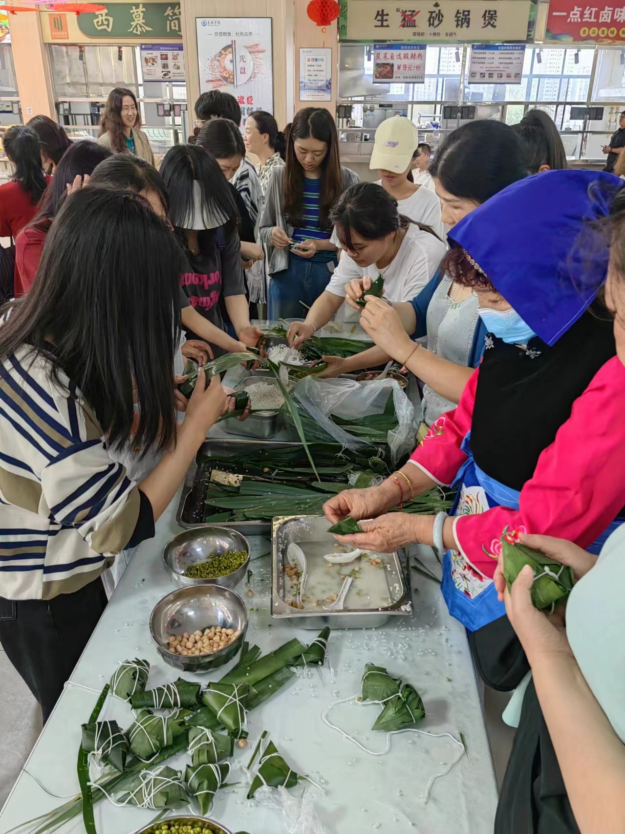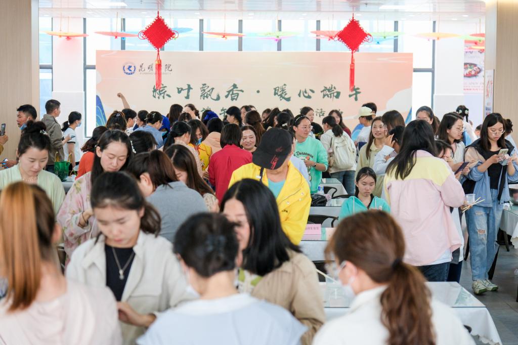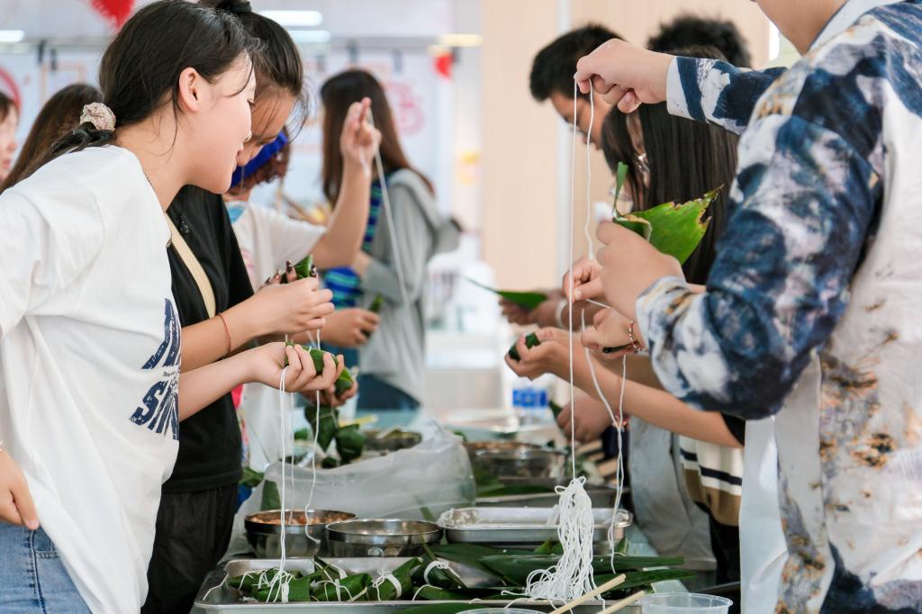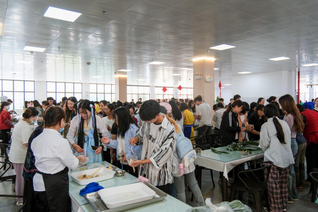 沁园教工食堂布置了粽子品鉴区和体验区。在粽子品鉴区,后勤集团各餐饮企业大展厨艺,制作了各种口味、食材的粽子让师生们品鉴美味。体验区邀请到了官渡区三位包粽子能手分享包粽子的技巧和心得,指导师生包粽子。大家相互展示自己的劳动成果,佩戴上表达祈福安康的五彩手绳,活动现场充满了欢声笑语。