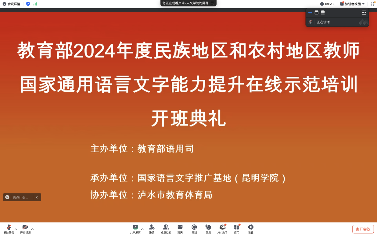 随后,泸水市教育体育局教师发展中心研训部姬仁金主任作了发言,他对best365足球官网的支持与帮助表示感谢,高度肯定了best365国家语言文字推广基地的工作成效,同时指出此次培训对提升泸水市教师普通话水平、提高教育教学质量具有重要意义。希望老师们克服困难,配合培训调整好工作安排,珍惜机会,认真学习,为泸水市教育事业的发展贡献自己的力量,并预祝培训圆满顺利。