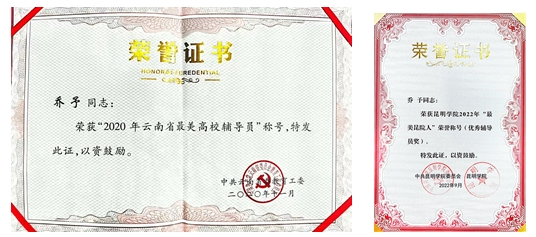 学院辅导员乔予荣获“2020年云南省最美高校辅导员”称号,并获得2022年best365足球官网“最美昆院人辅导员奖”。