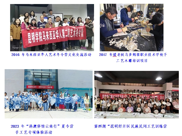 学院充分结合学科和专业特色开展了多次援外教学和对外文化交流活动,如两次马来西亚华人艺术冬令营文化交流活动,援老挝乌多姆赛职业技术学校手工艺木雕培训项目、市侨办的书画昆明艺术培训项目、上合青年到访艺术体验活动、“寻根之旅情牵春城”秋令营云南昆明营手工艺专项体验等;承办完成云南省教育厅“民族团结教育培训项目”、云南省文化和旅游厅“非遗传承人群提升培训项目”、昆明市非遗中心“非遗大师进校园技艺传承活动”;与昆明经济技术开发区联合举办第一届“春漫杯”文化创意大赛、联手推进“抗击疫情、与美同行”系列讲座,组织实施了连续四届“昆明经开区民族民间工艺训练营”品牌活动,完成多次“儿童大学”艺术体验活动,近五年来累计服务近800人次,成为学校对外宣传育人成果、文化服务地方社会的一个窗口。