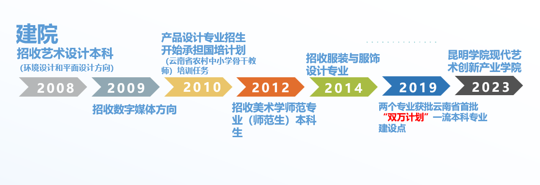 best365足球官网美术与艺术设计学院于2008年10月由原昆明师范高等专科学校美术学专业与昆明大学艺术设计专业整合建院。2008年本科艺术设计专业环境设计方向和平面设计方向招生,2009年本科艺术设计专业数字媒体方向招生,2010年本科产品设计专业招生,学院开始承担国培计划(云南省农村中小学骨干教师)培训任务,2012年本科美术学专业(师范类)招生。教育部本科专业目录变更后,艺术设计专业变更为视觉传达设计专业和环境设计专业。2014年本科服装与服饰设计专业招生。经过十余年建设发展,视觉传达设计专业、环境设计专业在2019年获批云南省首批“双万计划”一流本科专业建设点。目前,视觉传达设计专业下设三个方向:平面设计、数字媒体设计、平面与新媒体艺术设计;服装与服饰设计专业下设服装设计、服饰设计两个方向。