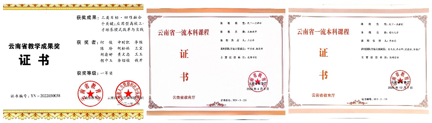 经过多年的积淀,学院学科实力逐年增强。现有云南省塑料薄膜制品技术研究工程中心、云南省金属有机分子材料与器件重点实验室、云南省高校食品安全检测技术重点实验室和云南省高校绿色有机资源化学科技创新团队、云南省高校新型能量转换和存储材料科技创新团队。近五年,学院共承担15项国家自然科学基金、60余项省级科研项目、7项横向课题,总经费达千万元以上。取得了丰硕的科研成果,获得云南省自然科学二等奖1项,三等奖3项;发表论文200多篇,其中SCI收录百余篇;授权发明专利30多项。