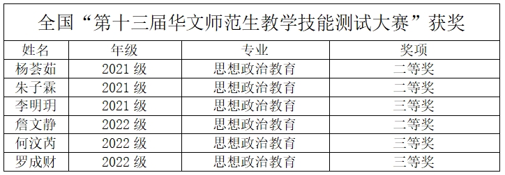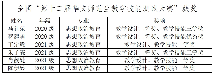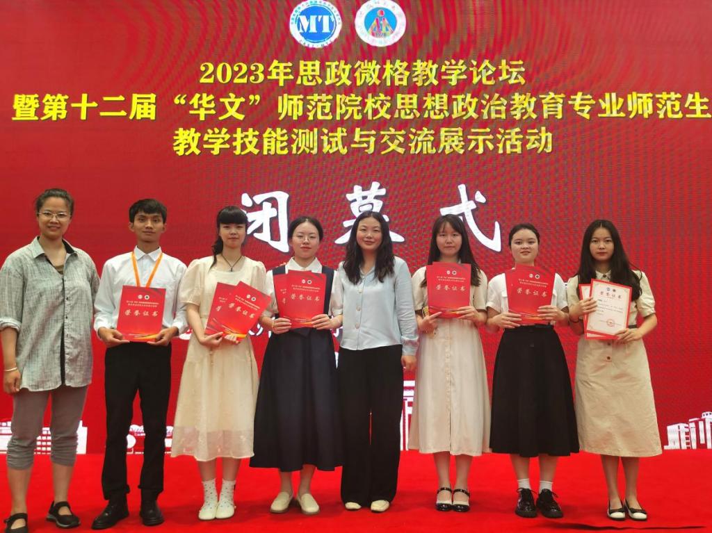 近年来,思想政治教育专业学生师范技能提升迅速,竞赛成绩优异。在全国“第十二届华文师范生教学技能测试大赛”中,参赛学生获教学设计一等奖1人、二等奖3人、三等奖2人和教学技能一等奖1人、三等奖4人、优秀奖1人。在全国“第十三届高校思政教育师范生教学技能测试”中,参赛学生获二等奖3人、三等奖3人。学生制作微电影《路》荣获教育部习近平新时代中国特色社会主义思想大学习领航计划系列主题活动“我心中的思政课”第七届全国高校大学生微电影展示活动长视频组·二等奖;学生作品《红色家园》视频获2023年教育部高校“礼敬中华优秀传统文化”展播。