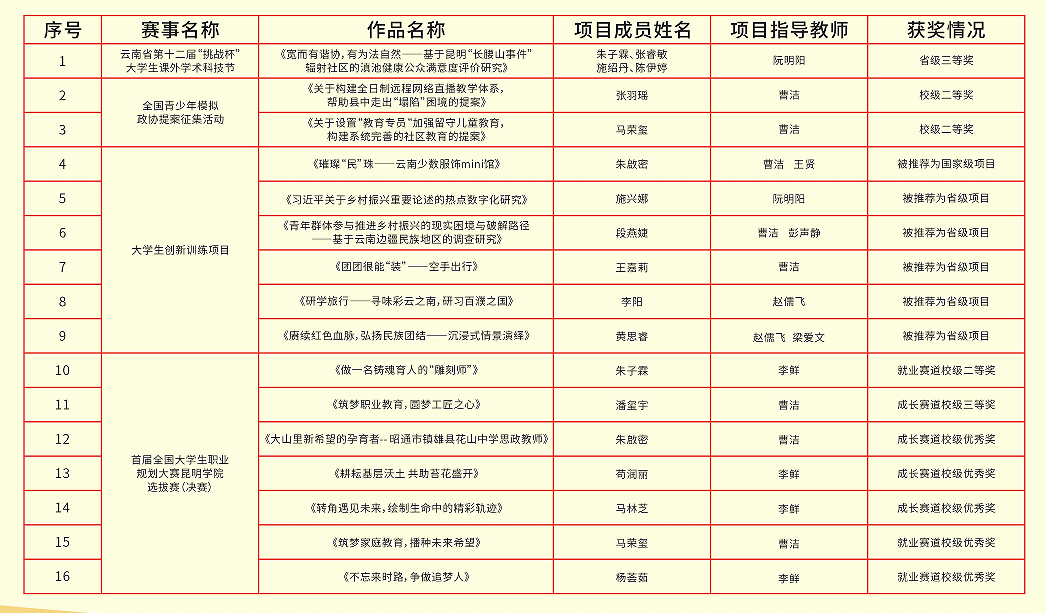 马克思主义学院现有博士13人,“春城计划”青年拔尖人才3人。2023年以来,获省部级以上领导批示1份;出版专著1部,培育拟出版专著3部;公开发表论文7篇(普刊),培育拟发表论文3篇;培育申报国家级科研项目12项,培育申报省部级及以上科研项目7项;培育申报市厅级科研项目4项,已立项1项。学院教师发挥科研对教学带动作用,获省级教学比赛奖项11人次,校级奖项16人次,其中校级一等奖4人次,二等奖5人次。
