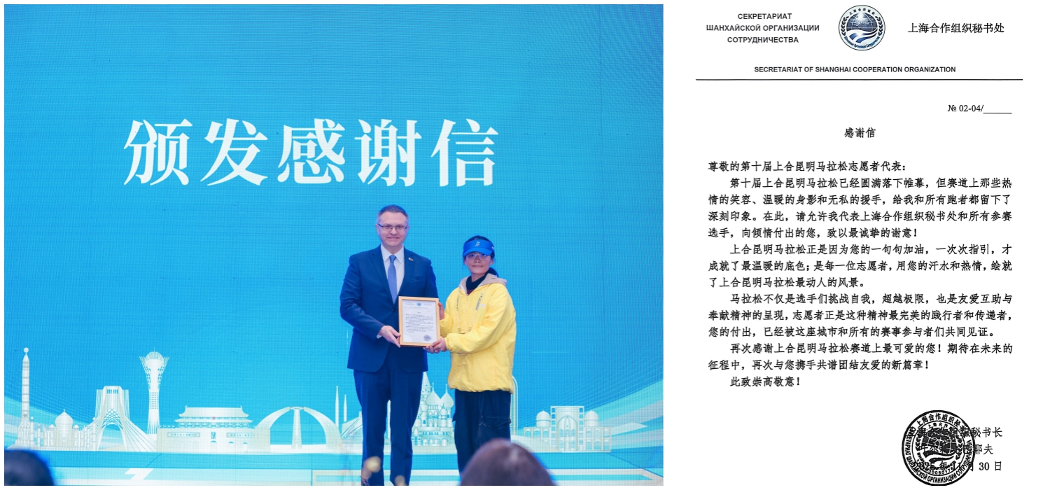 上海合作组织秘书长颁发的感谢信 上合昆明马拉松摄