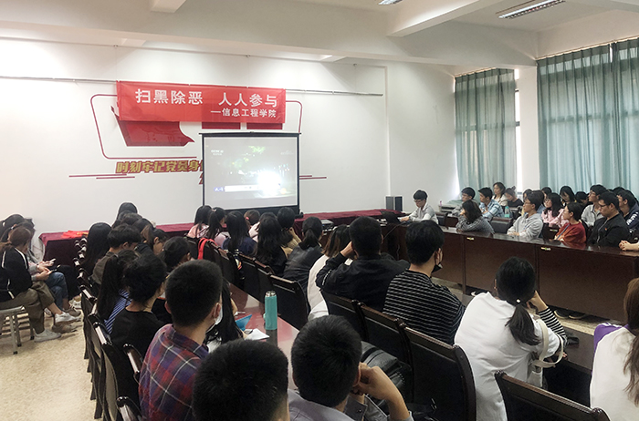 4月8日,信息工程学院党支部在惟实楼组织开展了“扫黑除恶 人人参与”主题党日活动。全体学生党员、预备党员以及积极分子参加活动,活动由党支部书记杨冬奎主持。