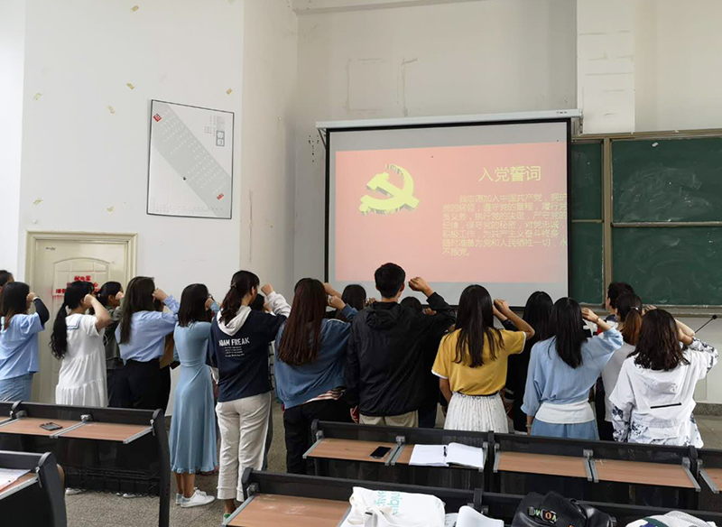 活动在庄严的《国际歌》中拉开帷幕,贾斌同志宣布学校党委关于接收人文学院22名预备党员的审批意见。与会老师为22名新审批的预备党员佩戴党员徽章,颁发党费证。紧接着22名预备党员面向鲜红的党旗,在何杰书记的带领下进行了庄严宣誓。预备党员代表龙蓉同志进行了发言。最后何杰书记作总结发言,勉励所有同志不仅要程序上入党,更要思想上入党,不忘初心、牢记使命,在学习生活和工作中积极发挥好先锋模范作用,争做新时代有担当的青年大学生。