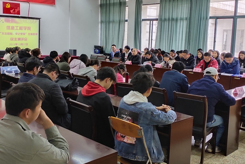 12月27日,信息工程学院在惟实楼3201召开“不忘初心、牢记使命”主题教育评估会。会议由党委书记陶军主持,学院党委班子、全体教师党员和部分学生代表参加会议。学校第二指导组宋敏敏老师到会指导。