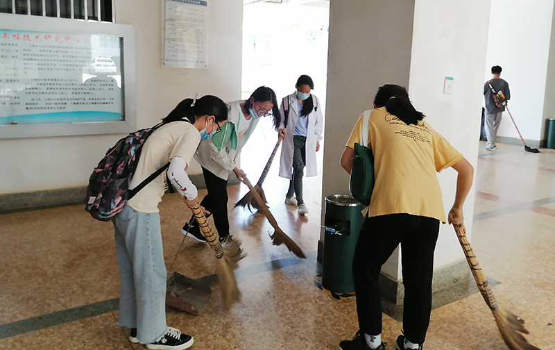 当天中午,学院19级的志愿者们自备拖把、扫帚、抹布等打扫工具到达惟真楼,根据安排的任务开始清洁活动。志愿者们在各组组长的带领下,对走廊、楼道、教室等卫生死角进行彻底清扫,对走廊、楼道、教室的地面用拖把进行两边以上清洗,对门、窗户、展示牌等用抹布进行抹拭。在大家相互协作、共同努力下教学楼被打扫得干干净净,就连角落里不起眼的小垃圾,志愿者们也没有放过。