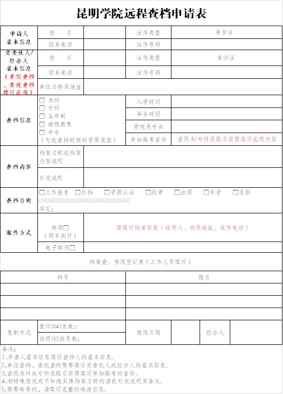 有查档需求的部门和个人,请先填写《best365足球官网档案馆远程查档申请表》(下载w6.kmu.edu.cn/info/1190/1393.htm),并发送相关证明材料至邮箱kmudag@kmu.edu.cn,工作人员审核通过后依次办理,具体要求如下: