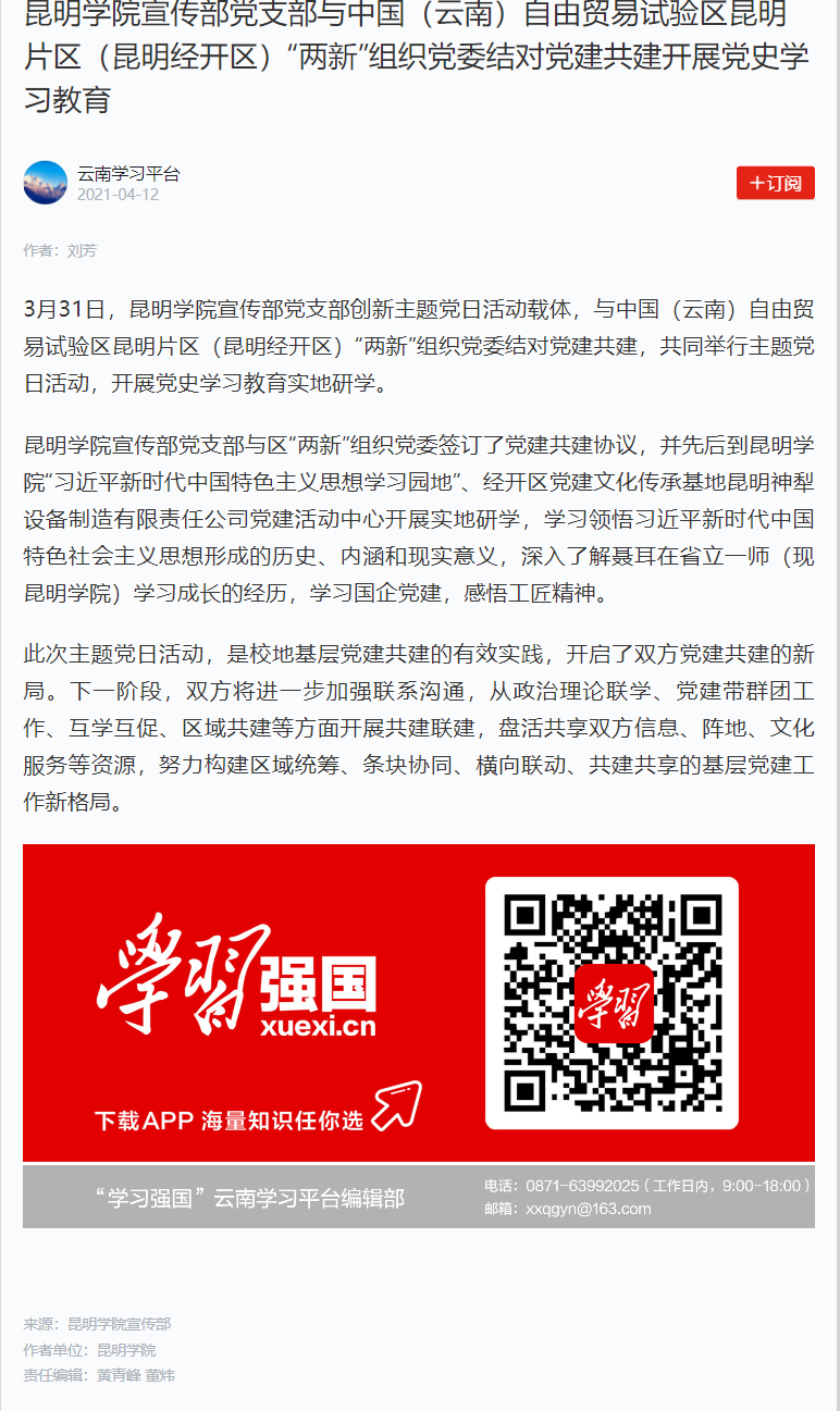 best365足球官网宣传部党支部与中国(云南)自由贸易试验区昆明片区(昆明经开区)“两新”组织党委结对党建共建开展党史学习教育