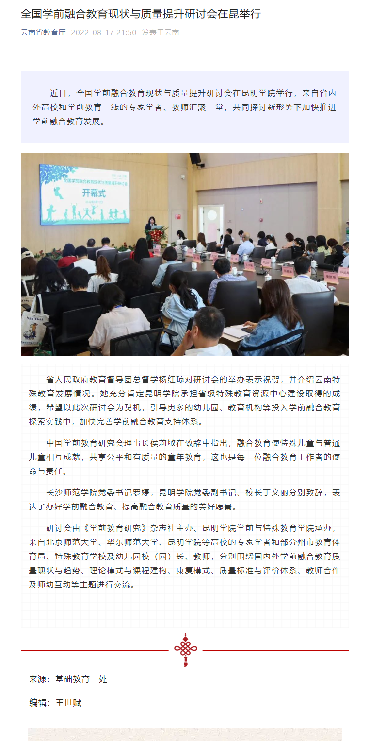 全国学前融合教育现状与质量提升研讨会在昆举行
